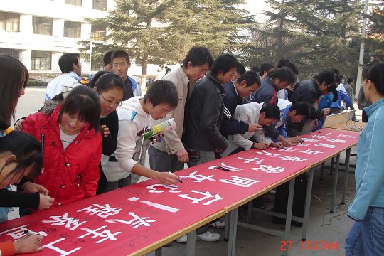 签名仪式上,系员工会主席代表全系员工向辛勤耕耘在工作岗位上的老师送上鲜花,以表达同学们对老师的深深敬意,倡议同学们以书信的形式向父母、老师表达感激之情,以激起同学们的感恩之心,提高广老员工的思想道德修养。