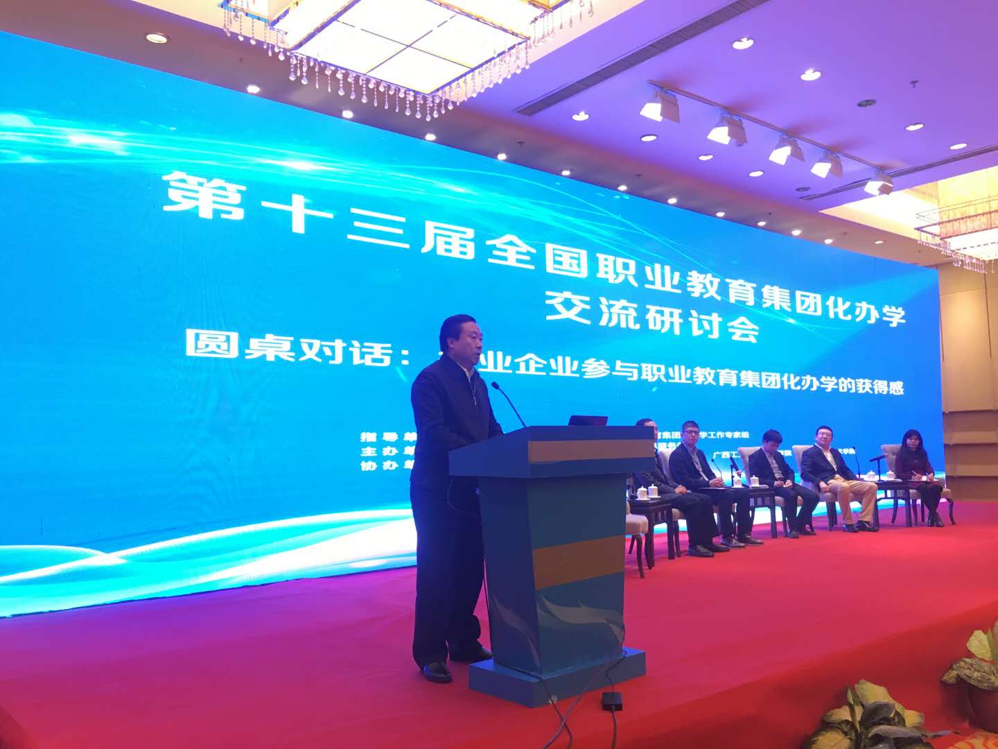 本次研讨会的主题是协同共舞、示范创建、特色发展。会上,中国职业技术教育学会常务副会长刘占山为本次会议致开幕词,并讲述了我国发展职业教育的重要性;中国职业技术教育学会顾问、教育部职业教育司司长刘来泉司长发言,提出努力使集团化办学成为中国特色职业教育的办学模式、提出高等公司共同组建产教融合集团(联盟),实施产、教、研相结合的理念。另外,教育部职业教育与成人司综合处处长宁锐、全国职业教育集团化办学工作专家组组长李祥林、广西壮族自治区教育厅副厅长黄雄彪及相关院校董事长等十五位专家从“产学研创”协同育人、行业企业参与职教集团化办学的获得感、协同创新驱动办学、职教集团与“一带一路”倡议等方面做了相关报告。报告指出我们应努力使集团化办学、国际化办学成为中国特色职业教育办学模式。提出打造产教融合集成化实践平台,深化产教融合、促进校企合作、助推产业升级。