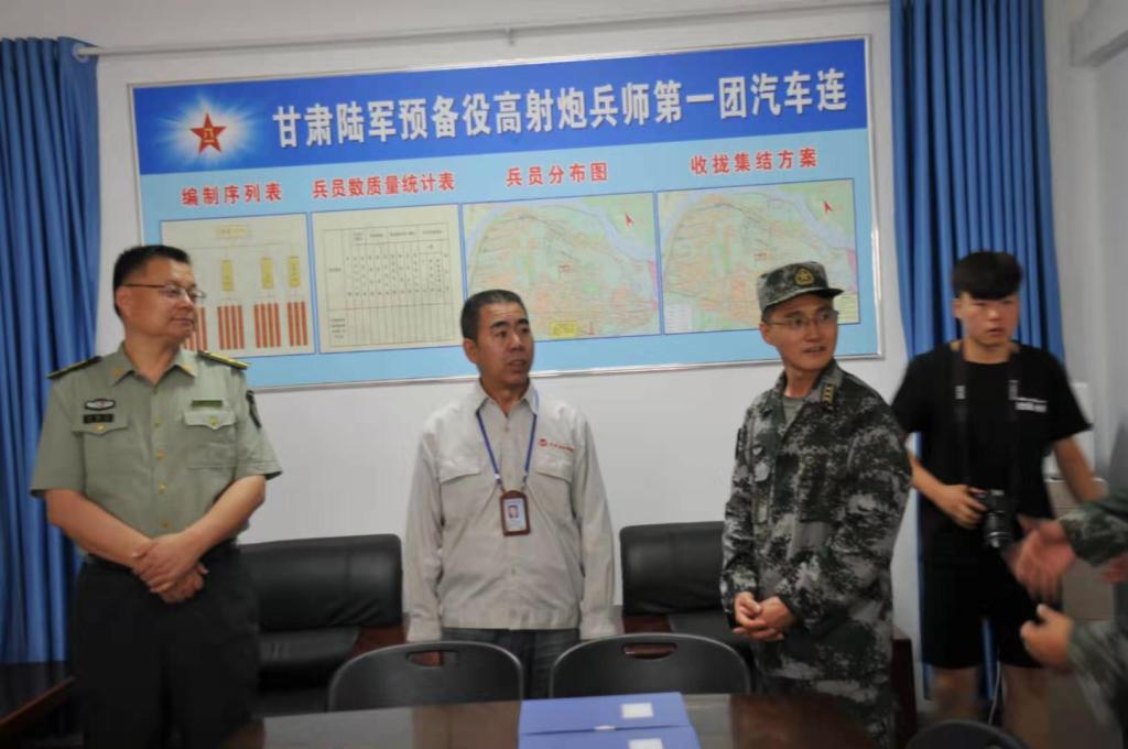 2019年6月25日,驻甘某陆军预备役高射炮兵师第一团团长杨明勤上校来公司检查预备役建设情况。他首先感谢公司党委、领导对国防建设的支持,对公司预备役汽车连建设情况给予了高度肯定,他指出公司领导班子对国防军事工作高度重视,机构健全,宣传广泛,措施得力,师生积极性高,工作落实标准高。公司党总支书记张文和,办公室主任冯乐雯陪同检查。