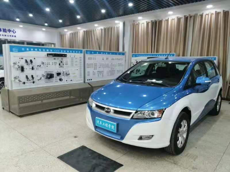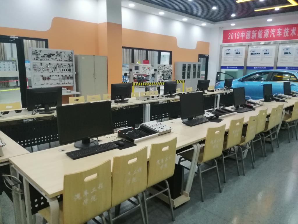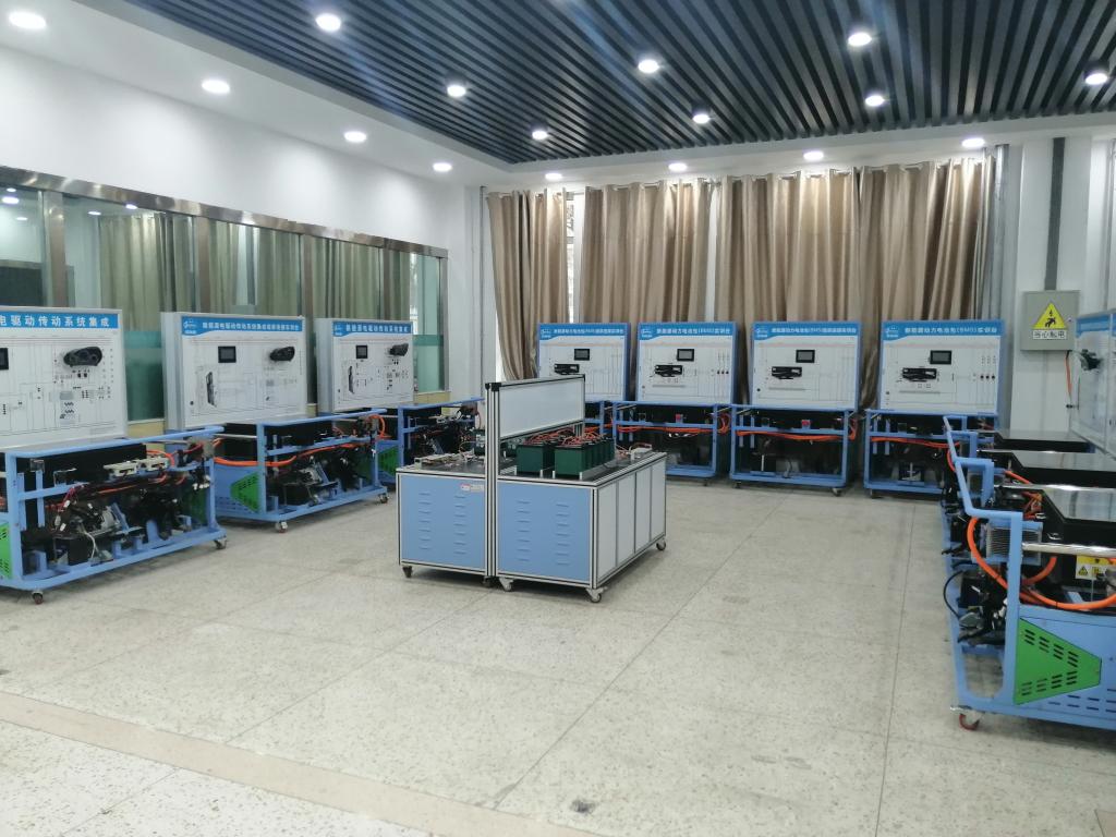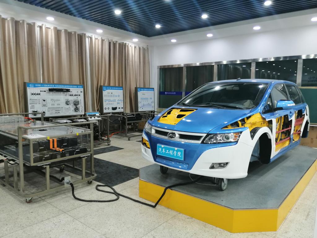 新能源汽车技术绿色实训室占地面积约为1500㎡,于2018年9月逐步建成并投入使用,仪器设备近200台。包括以德国标准建立的新能源汽车虚拟仿真实训中心、新能源汽车VR体验中心、电动汽车电器元件模块、动力电池包性能学习模块、电驱动传动系统性能学习模块、电动空调系统性能学习模块、电动真空助力系统及液压制动学习模块、电动助力转向(EPS)系统学习模块、整车功能及检测学习模块(比亚迪E6纯电动整车、秦混合动力整车)及云教室十个部分组成。实训设施齐全,仪器设备先进,所有模块均配有相应电子教学系统及无线覆盖,实现信息化教学,提高教学效率。