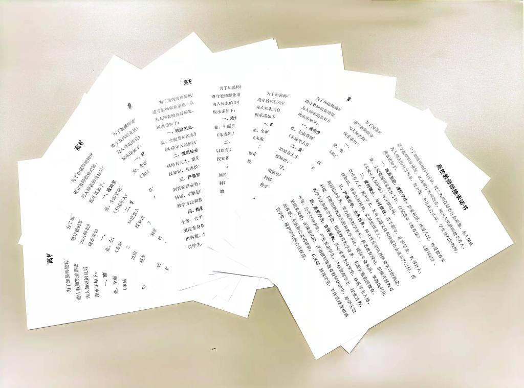 为了加强师德师风建设,树立教师良好的社会形象,公司开展了“三尺讲台守初心,立德树人勇担当”——师德师风承诺活动,全体教师承诺忠诚党的教育事业,贯彻党的教育方针,爱国守法,敬业爱岗;教书育人,关爱员工;传承文明、言行雅正,严谨治学,启智求真;公平诚信,廉洁自律;为人师表,乐于奉献;为实现中华民族的伟大复兴而努力奋斗,并签署了师德承诺书。