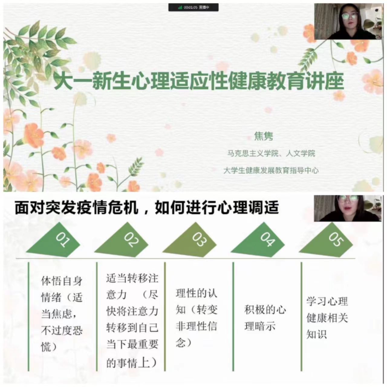 疫情期间如何进行心理调适模块中,焦老师指导同学们通过5个步骤缓解情绪。第一,体察自己的情绪,释当焦虑,不过度恐慌;第二,将注意力转移到当下最重要的事情上来;第三,理性的认知;第四,积极的心理暗示;第五,学习心理健康相关知识。正确看待疫情,避免过度紧张,正确理解疫情信息,将注意力集中到学业和生活中。