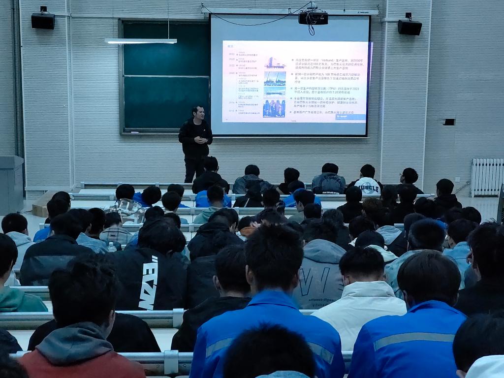 随后,黄志华先生以企业宣传片的形式将巴斯夫有限公司的产业成果、企业文化、企业发展历程向同学们做了展示。同时对巴斯夫一体化基地(广东)有限公司项目涉及的科技领域、专业方向、市场战略和产品类目等内容做了详细的介绍。 宣讲会后,企业代表与同学们进行了面对面交流,对同学们关心的企业实习的具体要求、人才培养目标、未来职业发展路径等做了耐心的解答。