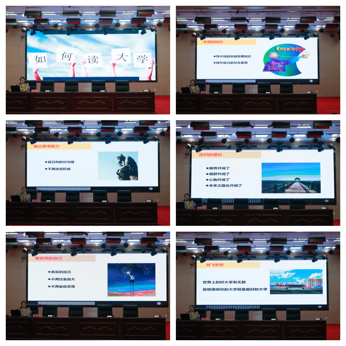 首先,她讲到大学是一个全面提升自我、发展自我的大平台,大学时期是一个时光宝石,大学阶段的目标会因人而异,合理的未来规划要从认识自我开始,在学习和生活的过程中发掘自己真实的志趣,评判自己的优势和不足。既不要放弃自己得天独厚的长处,也不要忽视那些阻碍你发展的短板,努力提高自我价值,成为更优秀的自己。希望几年后大家走出校园时,多了一份学历敲门砖,认识了一群志趣相投的同学,掌握了丰富的知识和扎实的专业技能,增长了见识,提升了修养与气质,具备持续的自觉和自律,拥有懂得为他人着想的感恩和善良。