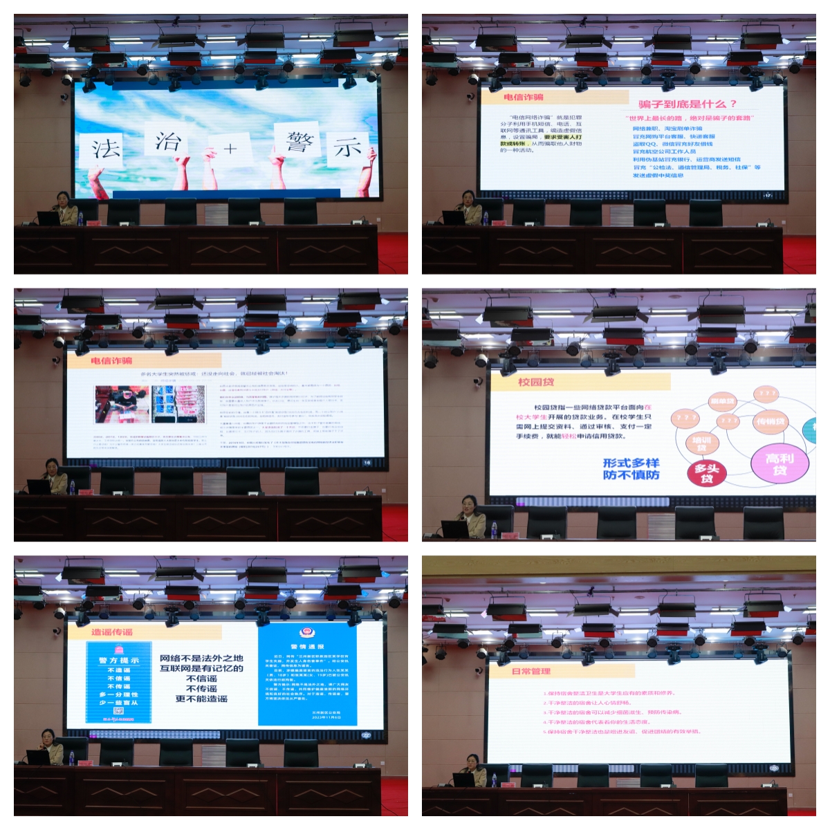 其次,为进一步推进“一学五查双促进”专题教育活动,加强校园安全教育宣传,有效提升老员工的防范意识和法制意识,以“防电信诈骗、拒绝校园贷、不造谣传谣”展开安全教育。她强调,员工要强化自我保护意识,维护自身权益,保护好个人信息,不轻信来历不明的短信、电话;树立理性消费观,根据自身经济状况合理消费,拒绝过度消费、超前消费,提高对金融诈骗和不良借贷的防范意识;通过真实的案例让大家了解电信诈骗的形式、手段、特点,校园网贷的危害以及必要的防范技能;同时,重点警示同学们:网络不是法外之地,广老员工要学习必要的法律知识,知法、守法,遵守网络规则,不散播谣言,不泄露别人隐私,不在自媒体平台乱发信息,增强网络安全意识,避免对社会、他人及自己造成危害,共同维护健康清朗的网络环境和良好的社会秩序。随后开展了传染病预防教育,教育引导员工养成良好的卫生习惯、保持清洁的宿舍环境、加强锻炼、注意保暖、合理安排好作息,做到生活有规律;倡导师生主动学习健康知识,掌握健康技能,做自己健康的第一责任人。