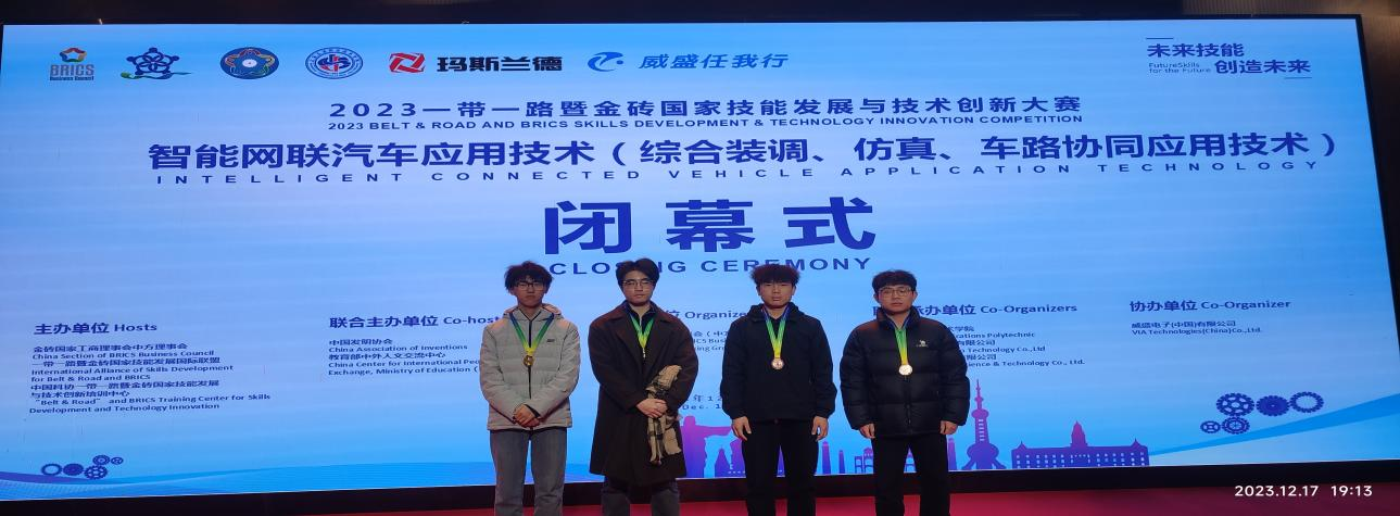 第七届一带一路暨金砖国家技能发展与技术创新大赛总决赛于12月14日-17日在上海交通职业技术公司举行,汽车公司派出4名选手参加了智能网联汽车应用技术(综合装调、仿真、车路协同应用技术)赛项,经过激烈比拼,张康琰、刘子赓荣获高职组一等奖(金牌),鲍德天、顾鑫山荣获高职组三等奖(铜牌),张维军、孙怀君获得优秀指导教师,公司荣获最佳组织奖。