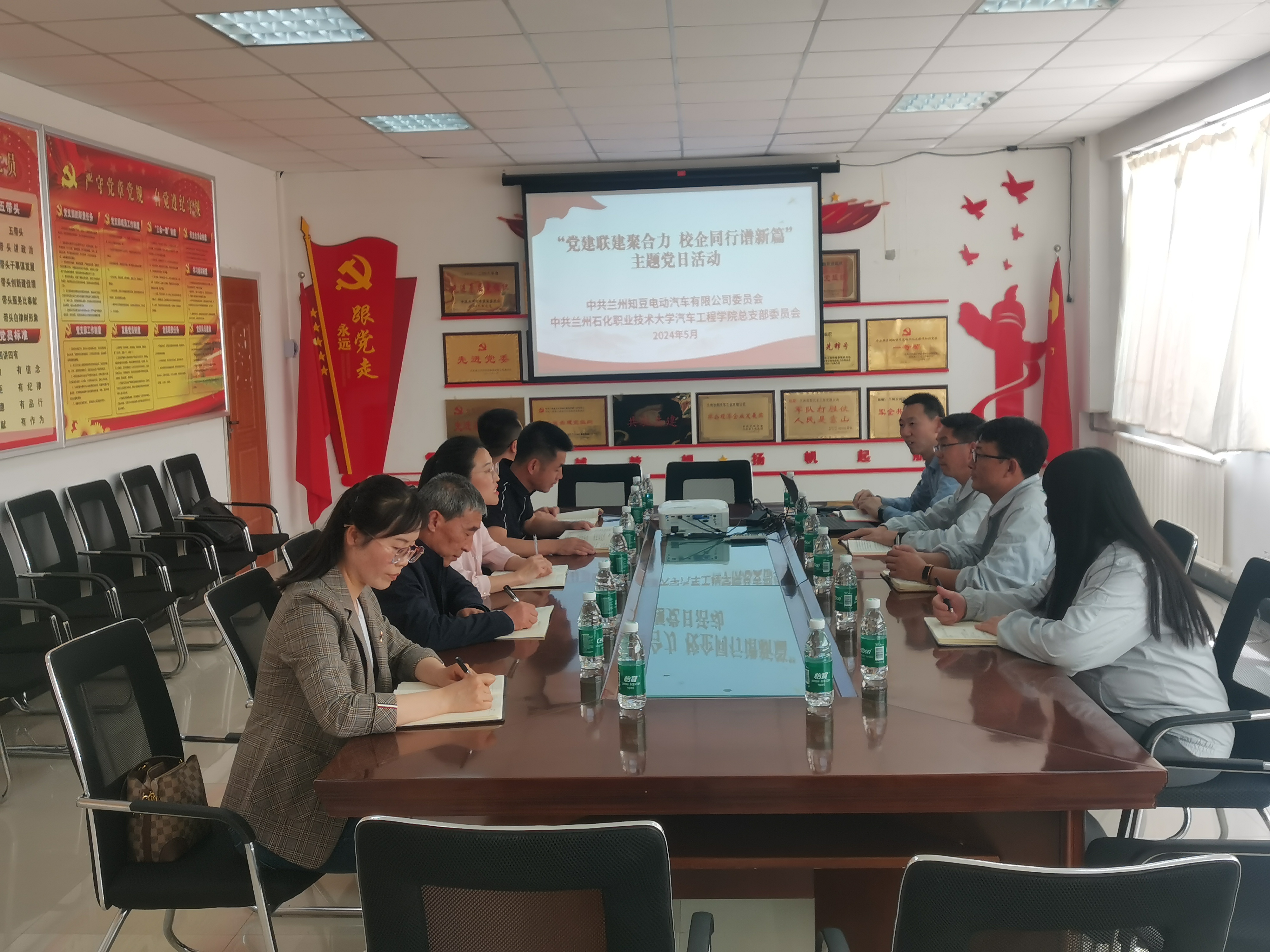 活动中,公司党总支书记详细介绍了公司党建工作和员工就业情况,她希望通过开展党支部共建活动进一步汇聚院企双方在党建方面的优势资源,促进院企党建互联互通互动,实现院企“党建共建、资源共享、发展共鸣、合作共赢”的既定目标,推动院企双方深度合作,助力院企党建融合发展,切实提升党建工作水平和联合共建的实施效果,形成更具引领性、示范性的党建品牌。兰州知豆电动汽车有限公司党委副书记全面介绍了公司发展情况,他认为,院企党组织联建合作是统一思想、凝聚力量、促进合作和共同发展的重要途径和契机。通过共同开展联学、联建人才培养基地、开展产学研合作项目等方式,实现院企双方资源共享和优势互补,为企业提供精准的人才服务和研发赋能,对破解集团发展中遇到的难题提供解决之道。随后,双方还就支部建设情况、党支部标准化建设经验、校企合作等进行了座谈交流,并深入探讨了如何以党建引领促进校企事业发展、如何优化校企合作形式和内容、如何实现校企质量化建设等工作。